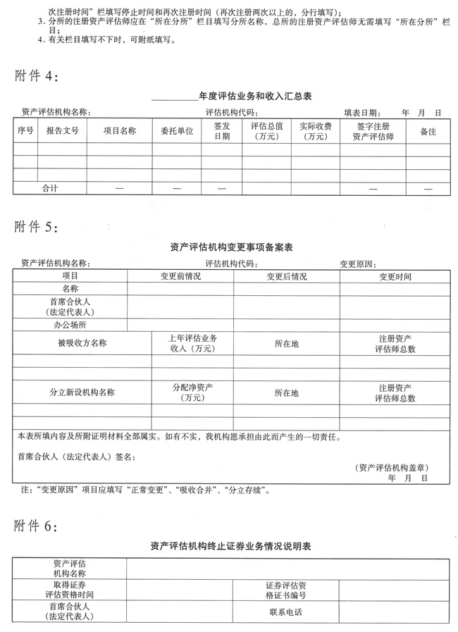 (五)具有证券评估资格的资产评估机构,除被依法撤销、撤回证券评估资格外,不再从事证券业务的,应当交回证券评估资格证书,并按一式三份提交资产评估机构终止证券业务情况说明表(附件6)。